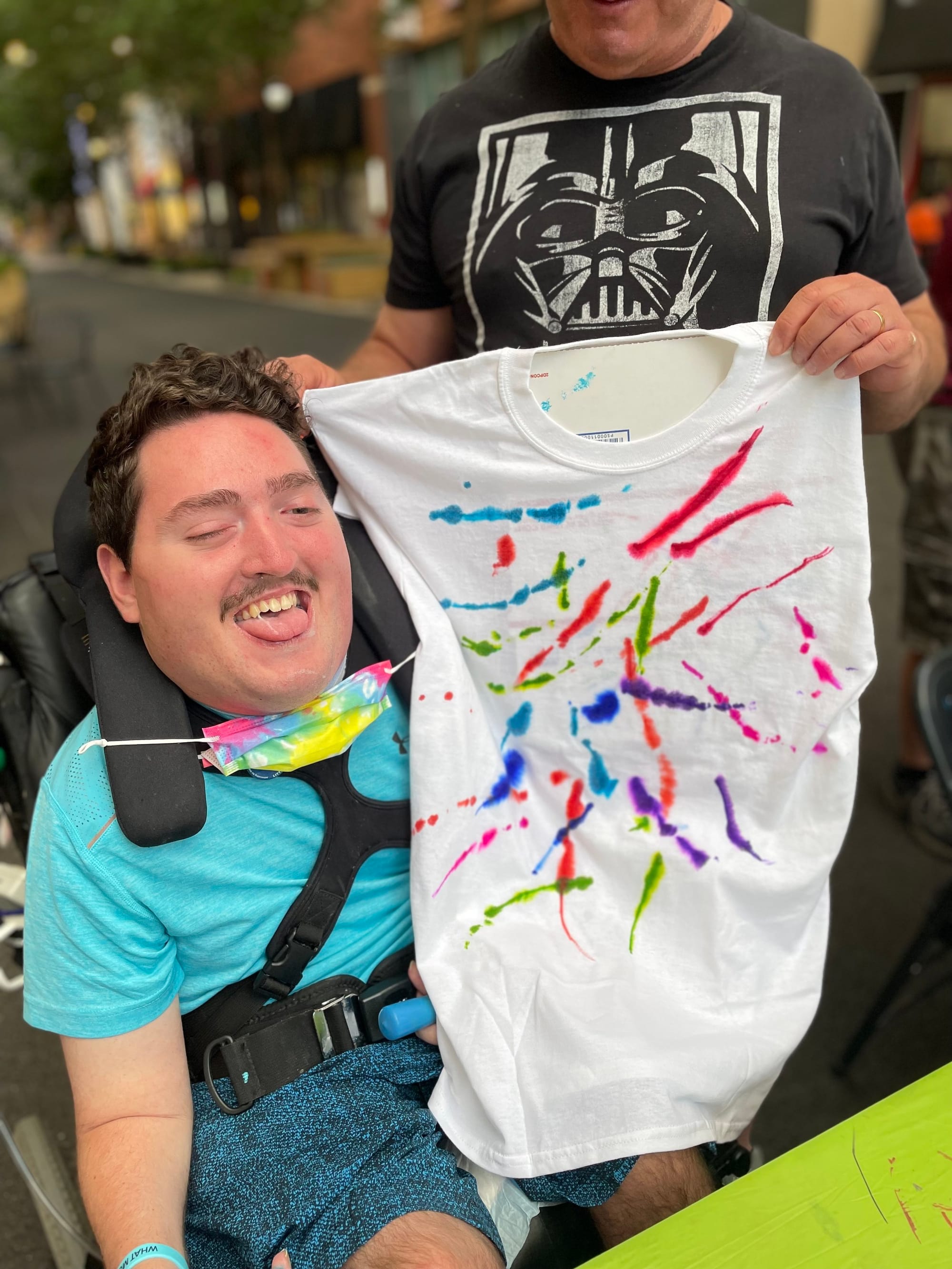 Rob earlier this summer, before he contracted Covid. Rob is at an outdoor art class. He is seated in his wheelchair with a tie-dye surgical mask over his tracheostomy tube. His dad stands next to him, holding up a white t-shirt with a design Rob drew on it for the class project.