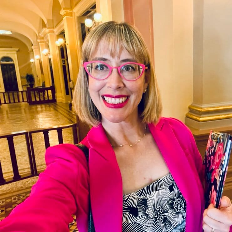 Jenny takes a selfie in one of the California Assembly buildings in Sacramento. She wears her trademark bright pink glasses, as well as a bright pink blazer. Behind her are the ornate columns, gates and tile floors of a legislative building.