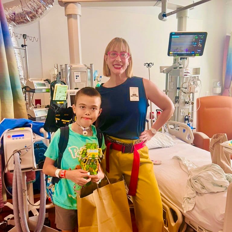 James (l) and Jenny (r) pose in a hospital room at discharge. Jenny is wearing bright pink eyeglasses and has chin-length blonde hair. James is wearing a sage green Pokemon shirt and holds a paper shopping bag and a robot. Behind them are an unmade hospital bed, and a variety of medical equipment and monitors.