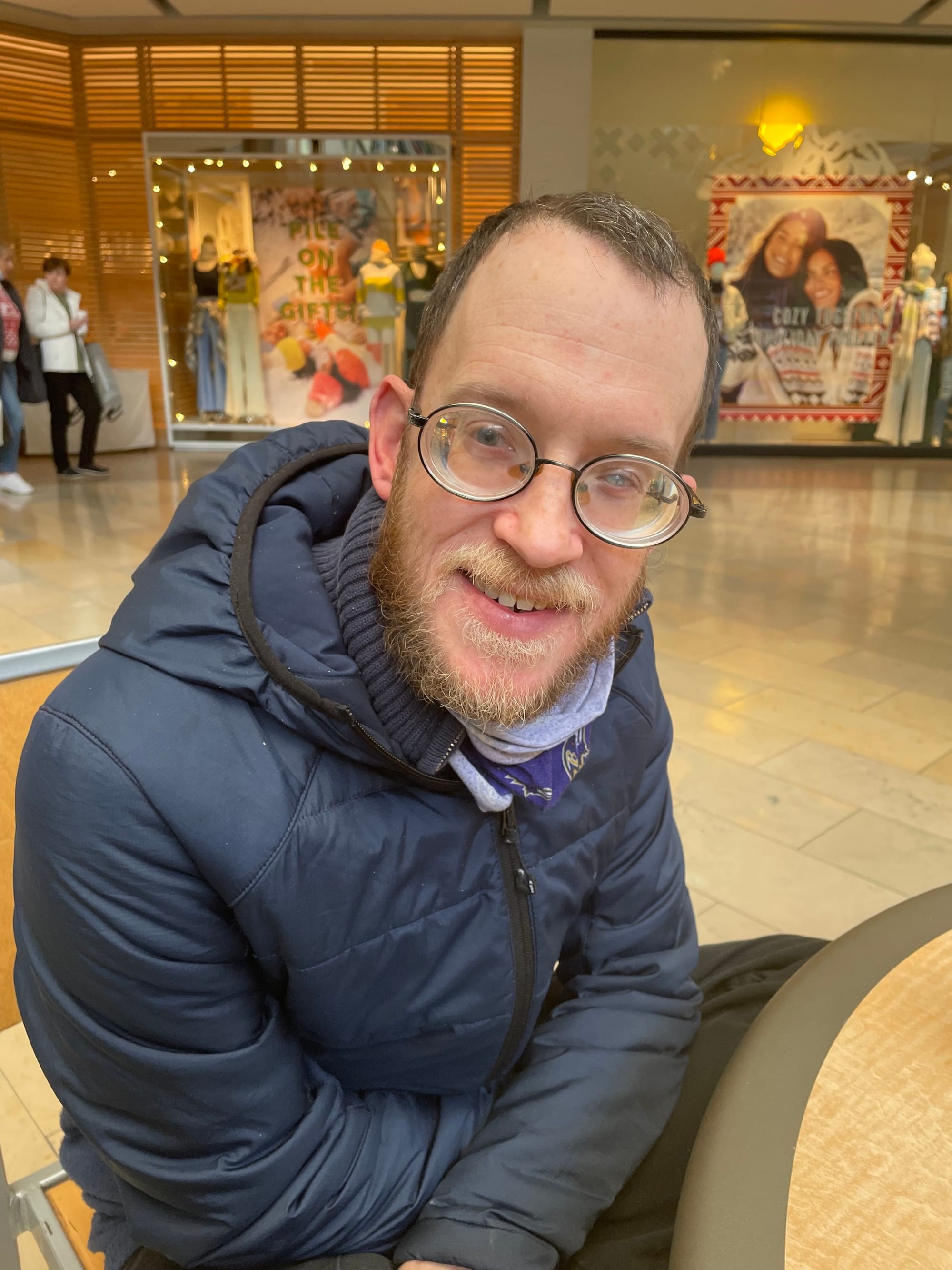 Matthew Plantz at a local shopping mall. He wears a blue jacket and glasses, and sports a beard and mustache. Storefronts are behind him.