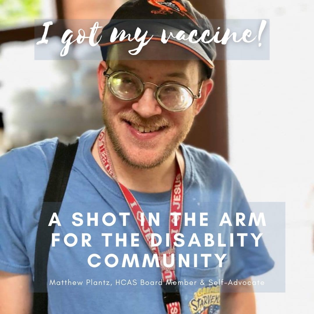 Matthew Plantz wears a black baseball cap and a blue t-shirt. The photo displays the words, “I got my vaccine! A shot in the arm for the disability community.”
