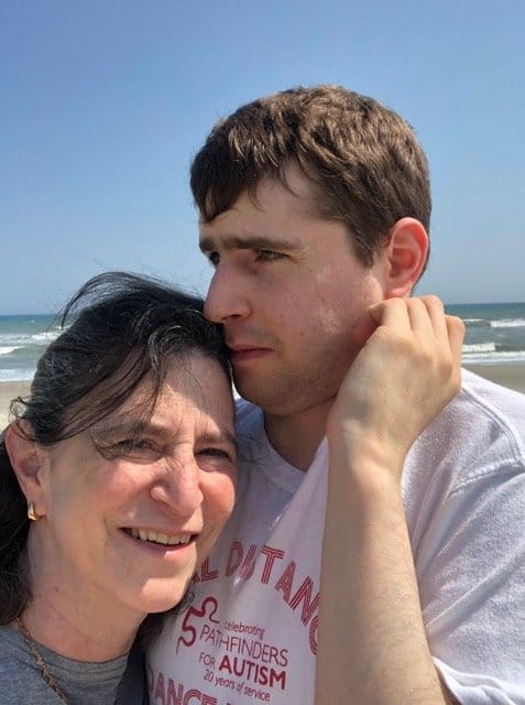 Alicia and Al Wopat [image description: A mother and her adult son, both with light skin and dark hair, pose at the beach. The mother is looking into the camera, the son looks away with a hand up toward his ear. He wears a white t-shirt with red lettering.]
