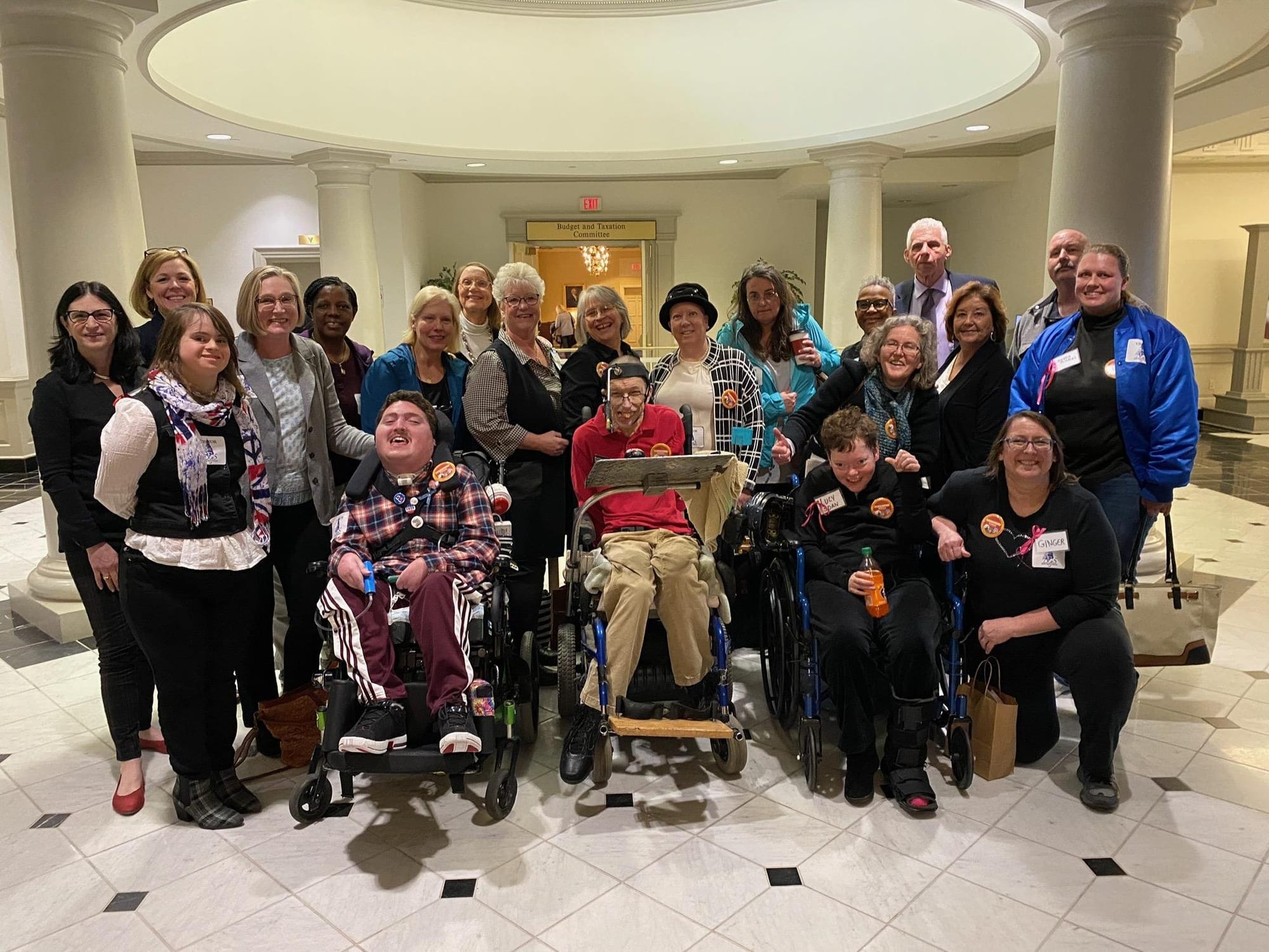 SDAN at Maryland’s General Assembly, pre-pandemic [image description: A group of 20+ people pose in three rows in an office building’s atrium. The floor tiles are white with smaller black tiles interspersed. Four large white columns in a classical style dominate the background. The persons in the photo wear work-casual clothing and are dressed for winter. In the first row are several persons who are wheelchair users.]