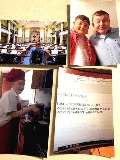 Photo montage, clockwise from upper left: Matthew poses in the Kentucky state legislature; Sherry & Matthew; Matthew’s long-term goals; Matthew cooking. [image descriptions: Snapshots lie on a countertop—A young man with light skin & a blue sweater vest and button-down shirt poses in a hall filled with desks; a mother with short hair, a red jacket, red scarf and white blouse poses with a young man in a light blue button-down shirt; a computer screen with the words, “Matthew’s Longterm goals / I like go to college to be chef / work at Mexican restaurant as a chef / work with my mom”; the young man cooks at a stove wearing a red chef’s hat.]