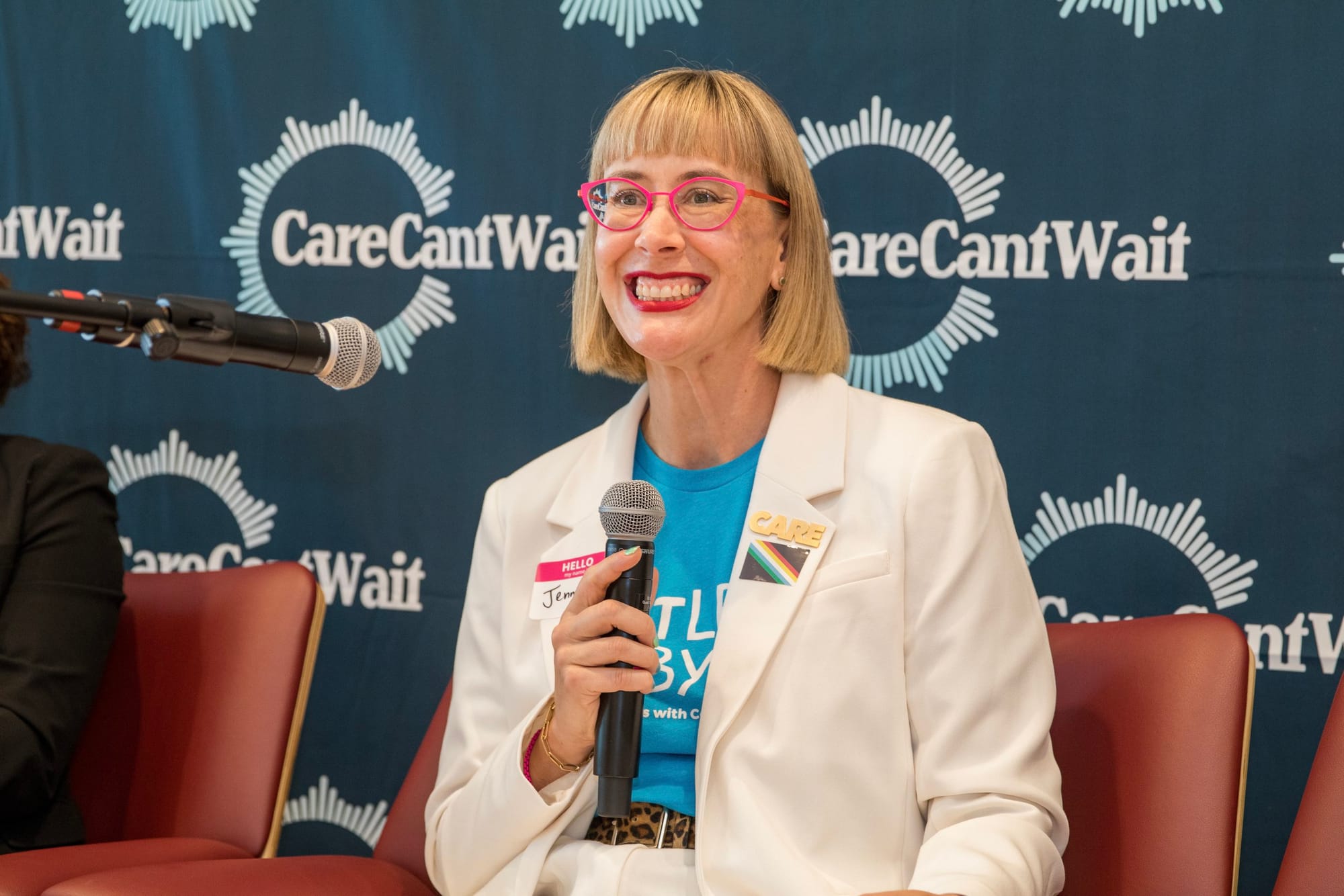 Photo credit: Tirrea Billings. Description: Jenny McLelland, a white woman with chin-length blond hair holds a microphone. She’s seated in front of a navy blue backdrop with the Care Can’t Wait logo on it. She wears eyeglasses with bright pink frames, a white suit jacket and a turquoise Little Lobbyists t-shirt.
