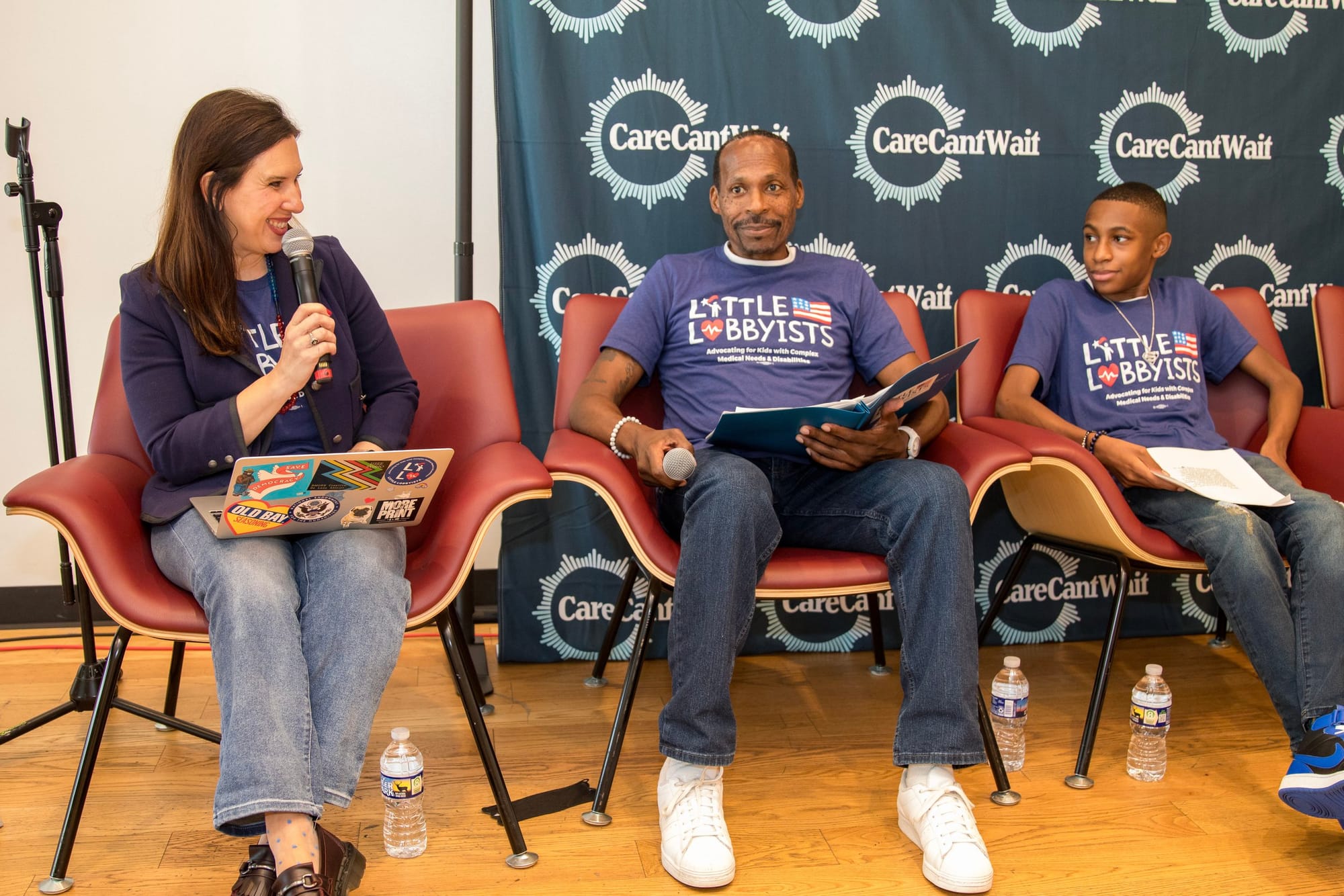 Photo credit: Tirrea Billings. Description: Laura Hatcher (white woman with long brown hair), Rico Winston (Black man with short hair and a mustache) and Isra’El Winston (young Black man with a short cut with a fade) sit in front of the navy blue Care Can’t Wait backdrop. They are all wearing jeans and dark blue Little Lobbyists t-shirts.