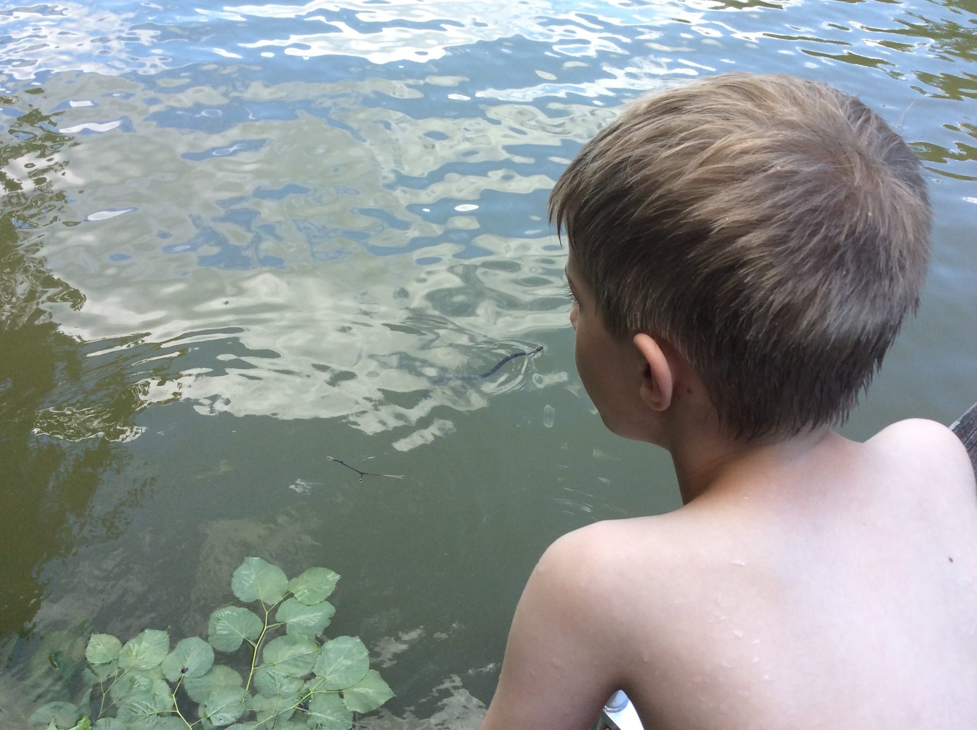 Agata’s son enjoying time at the lake. [image description: In the lower right corner, a young boy sits with his back to the camera. He has light skin and short blondish hair. He is looking out over a lake surface that is rippled and dappled with sunlight. There is a branch with small green leaves in the lower left corner, and there are tiny water snakes in the middle of the photo.]
