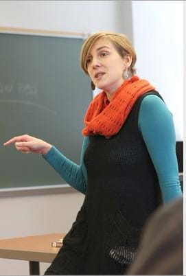 Agata in the classroom. [image description: A woman with light skin and short blond hair wears a black jumper over a teal long-sleeved shirt. She has a large orange scarf draped around her neck, and she wears large bronze-colored earrings. She is gesturing toward a large chalkboard in the background.]