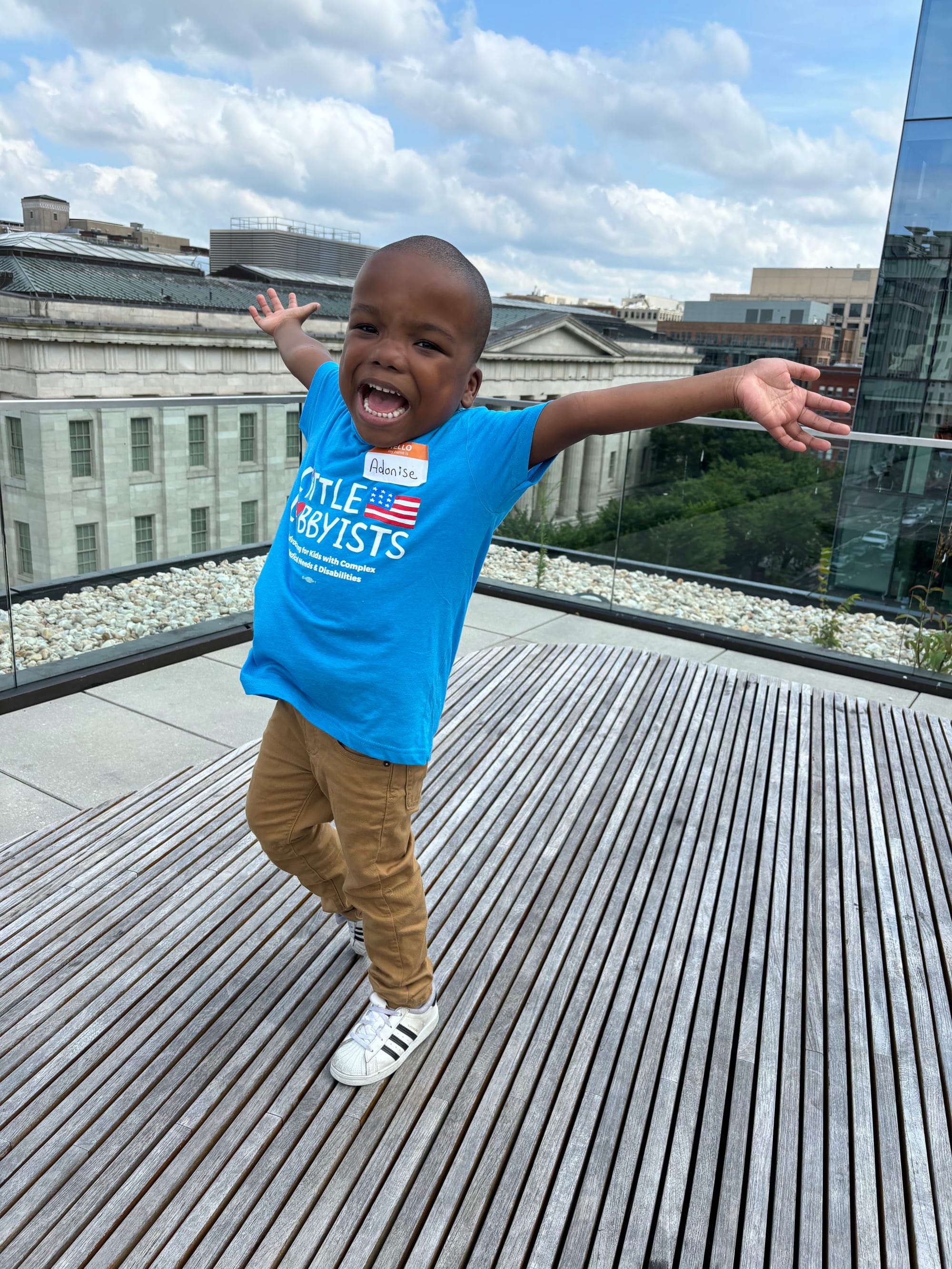 Adonise, an elementary-school-aged Black boy, poses with his arms out wide on the rooftop plaza of the MLK, Jr. Library in Washington, DC. He’s wearing a teal-blue Little Lobbyists t-shirt and khaki pants. The DC city skyline is behind him.