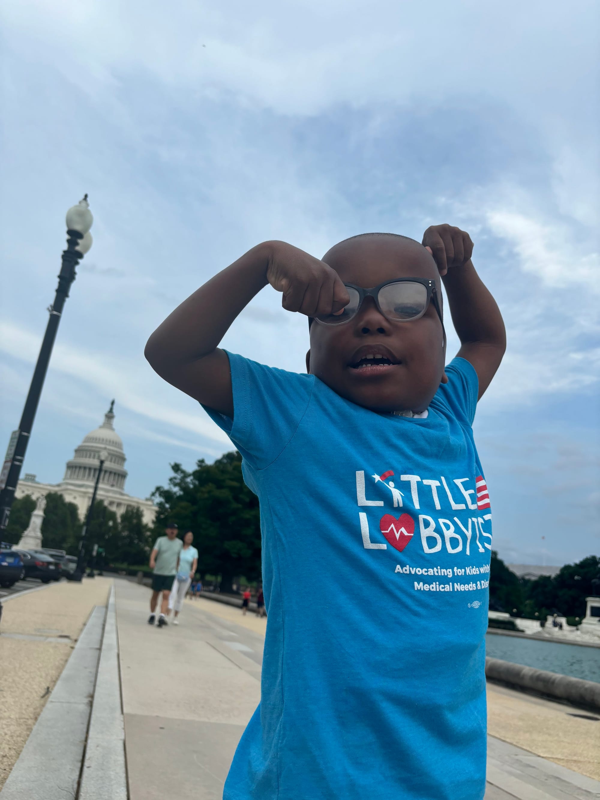 Wearing his eyeglasses and Little Lobbyists t-shirt, Adonis poses on a city street with the U.S. Capitol building the distance. He has both arms raised above his head and flexed in an expression of exuberant power.