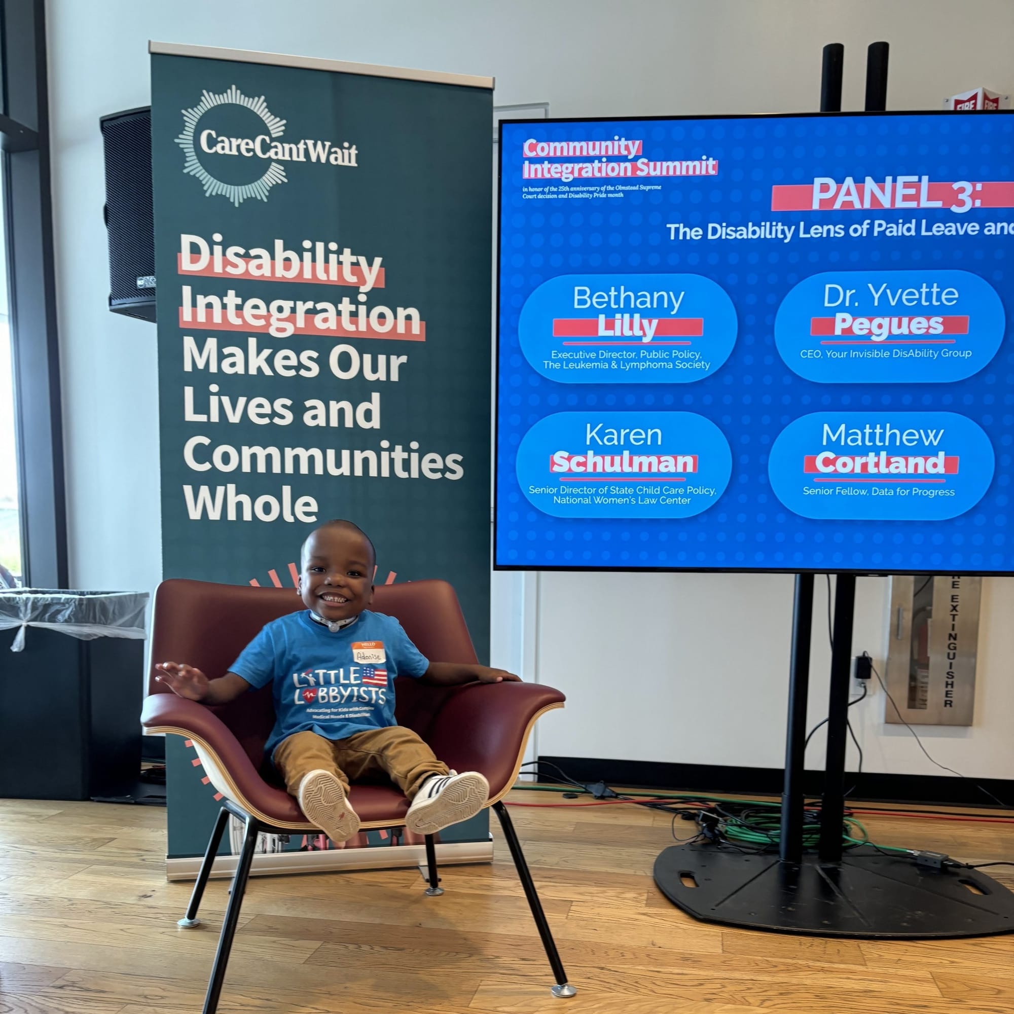 Adonise sits, smiling broadly, in a meeting room chair in front of a large banner that reads “Disability Integration Makes Our Lives and Communities Whole.” At the top of the banner is the Care Coalition logo, a corona around the words “Care Can’t Wait.” To the right of Adonise is an electronic sign displaying the topic of the next panel and the speakers on it.