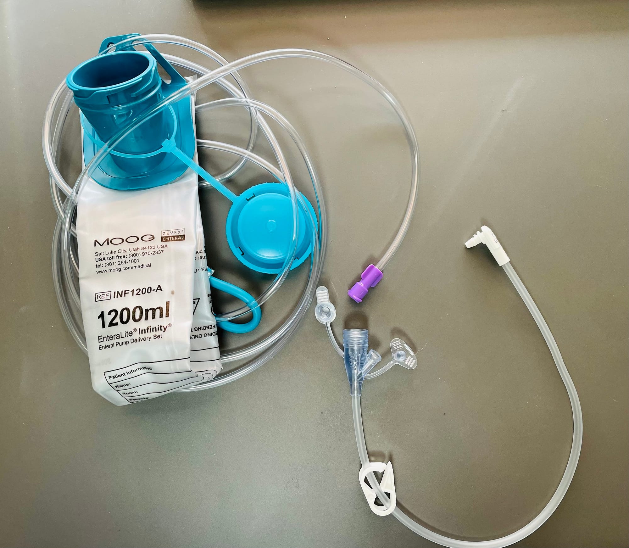 This is the feeding system G- and J-tube users have relied on for decades. Note how the white nozzle fits snugly into the extension set. [image description: A MOOG feeding bag (with aqua and purple features) is connected to an extension set.]