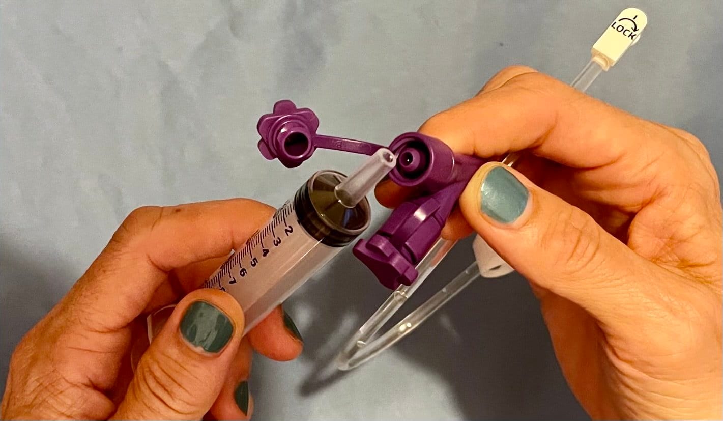 What new extension sets? I wondered. I asked my son’s home health aide. She said there were some unfamiliar supplies she had put away and showed me the new purple-adorned extension sets that connect the gastrostomy tube to the new purple-adorned feeding bags. The lovely purple ends on each screw into one another. However, the medication syringes we have available do not have these purple screw connectors and once we run out of our stock of the old extension sets, I will not be able to give my son medication.