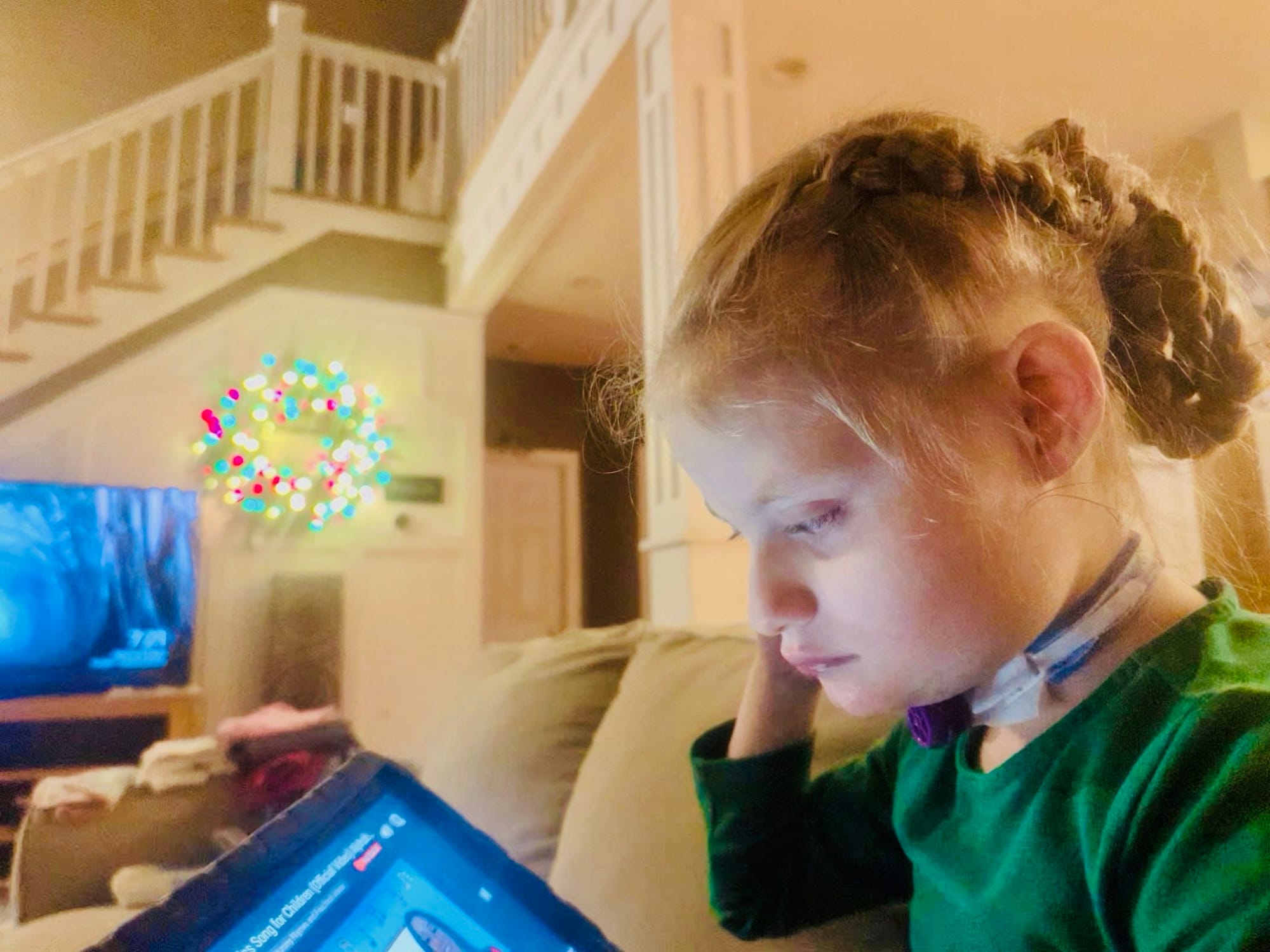Emma Staggs at home during the holidays. {image description: A young girl with a pretty updo of braids sits on a couch working with her communication device. She has a tracheostomy. In the background are stairs and decorative columns, and a brightly lit holiday wreath.]