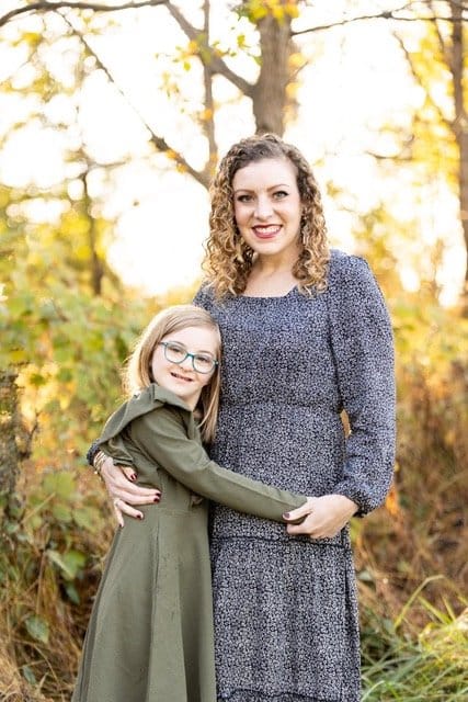 Lauren & her daughter Ellie [image description: A mother and daughter with light skin and blond hair pose in front of a leafy backdrop. The daughter has her arms around her mother’s waist. She wears a sage-green dress and turquoise-frame eye glasses. The mom wears a navy blue dress with a tiny white pattern.]
